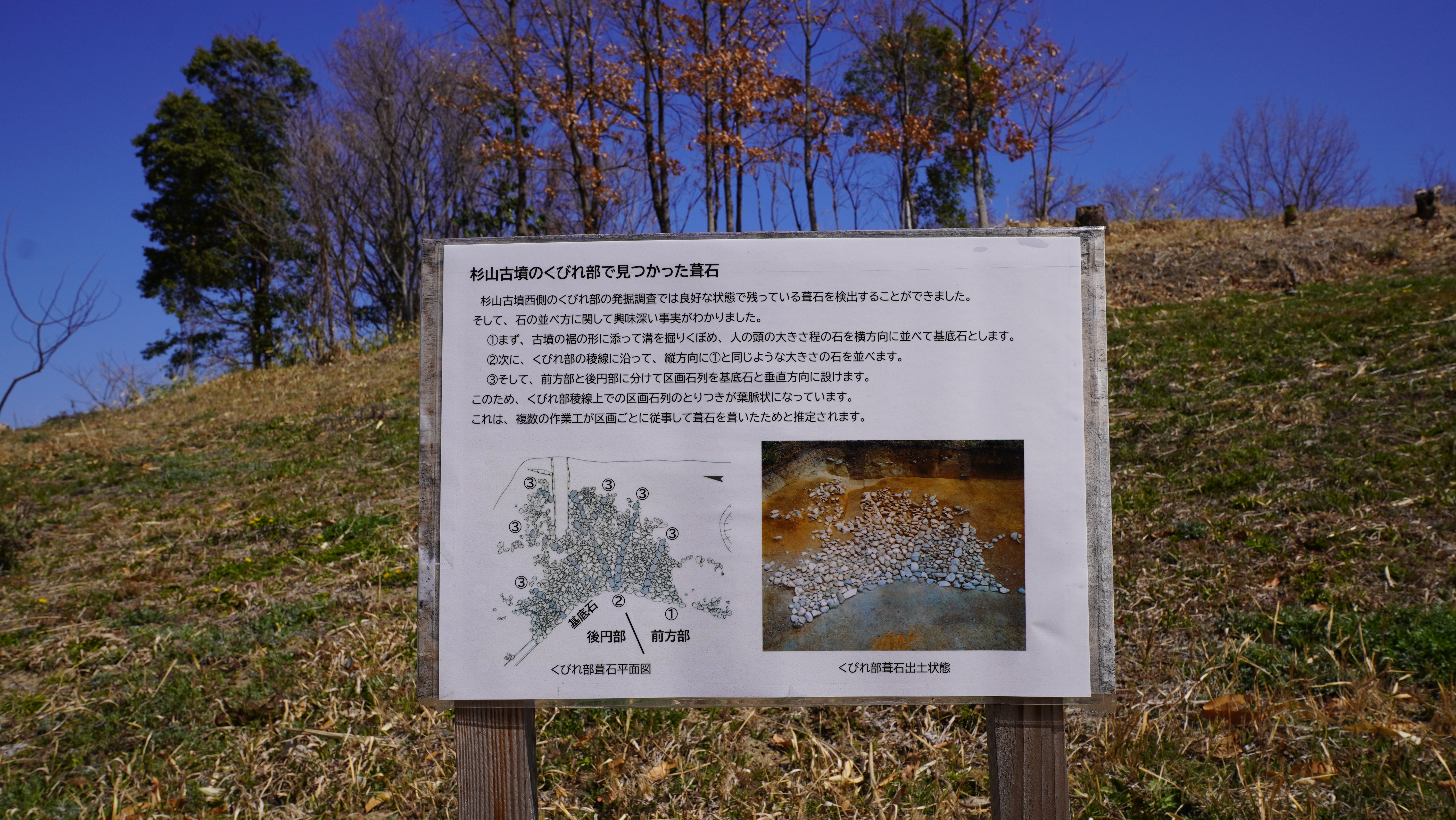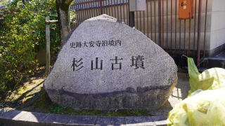杉山古墳は、5世紀後半に造られた前方後円墳でくびれ部には造り出しもあります。後円部80m、全長154mで周囲に濠が廻っていて全長が200mを超えるそうです。