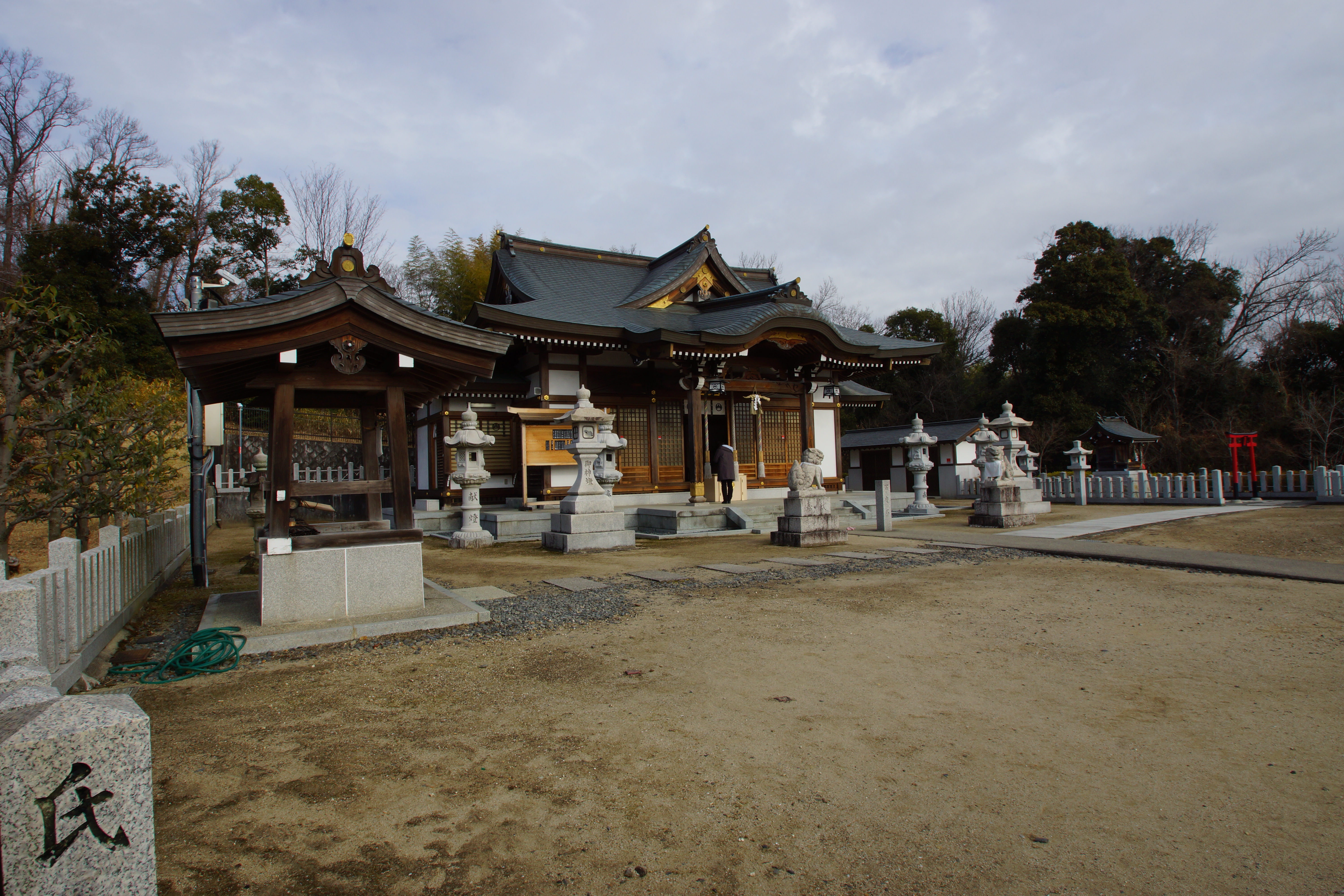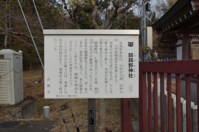 高槻市氷室町にある氷室地区の氏神神社です。闘鶏を「ツゲ」と読むのは鶏鳴が神託を「告げる」ことに由来するといわれ、名神高速道路にかかる陸橋が参道となっています。祭神は天照皇大神、応神天皇、天児屋根命で、闘鶏野は仁徳天皇62年頃、額田大中彦皇子の猟場であったといわれている。奈良の闘鶏野とともに、古事記、日本書紀の「氷室」発見伝承に基づいているといわれています。北面の丘陵には