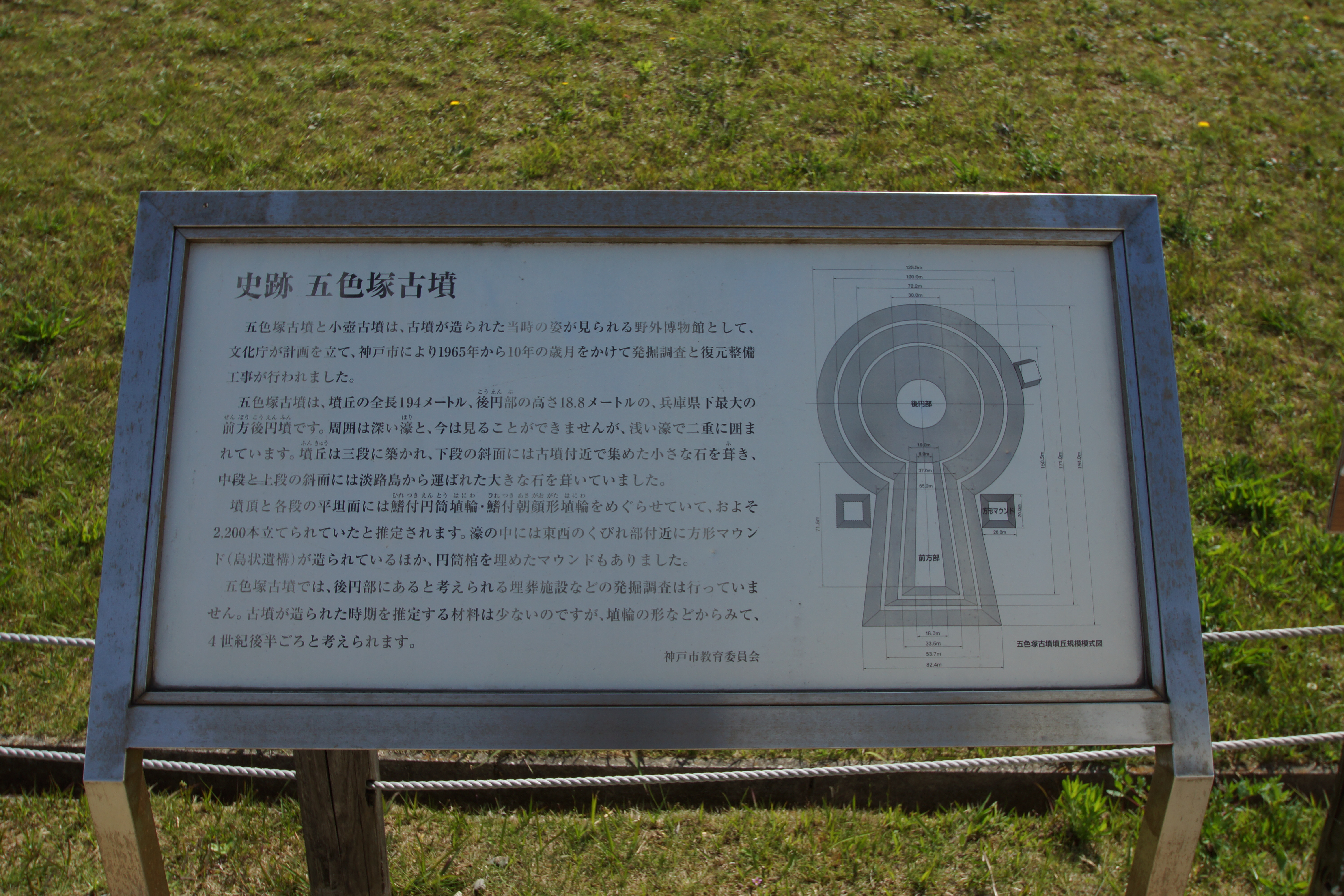 以前から行ってみたかった、神戸市の五色塚古墳に行ってきました。4世紀後半の前方後円墳(全長194m)で、戦中には一部畑化されていましたが、戦後復元されました。後円からは瀬戸内海が一望でき、当時の豪族の雰囲気が味わえます。現在の明石大橋を背景に、古代との融合が何ともいえません。埴輪は、殆どが鰭付きで隙間なく並べられ邪気が入らないようにしていたのでしょうか。