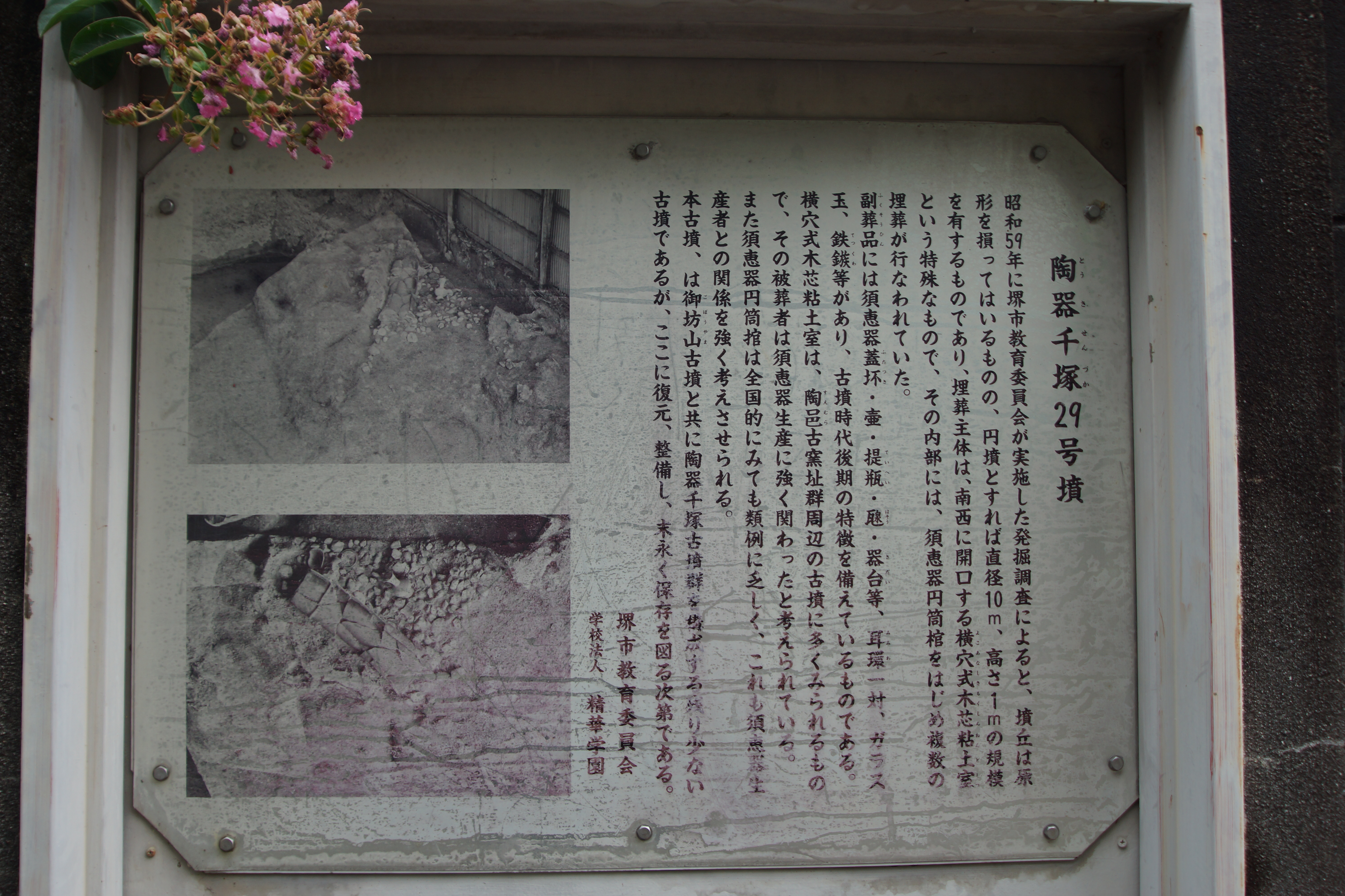 29号墳は、御坊山古墳の南20mにあり、直径10m前後の円墳で、埋葬の主体は「横穴式木芯粘土室」(よこあなしきもくしんねんどしつ)という特殊な構造で、さらに追葬時に須恵器の円筒棺という例のない棺を使用していた。