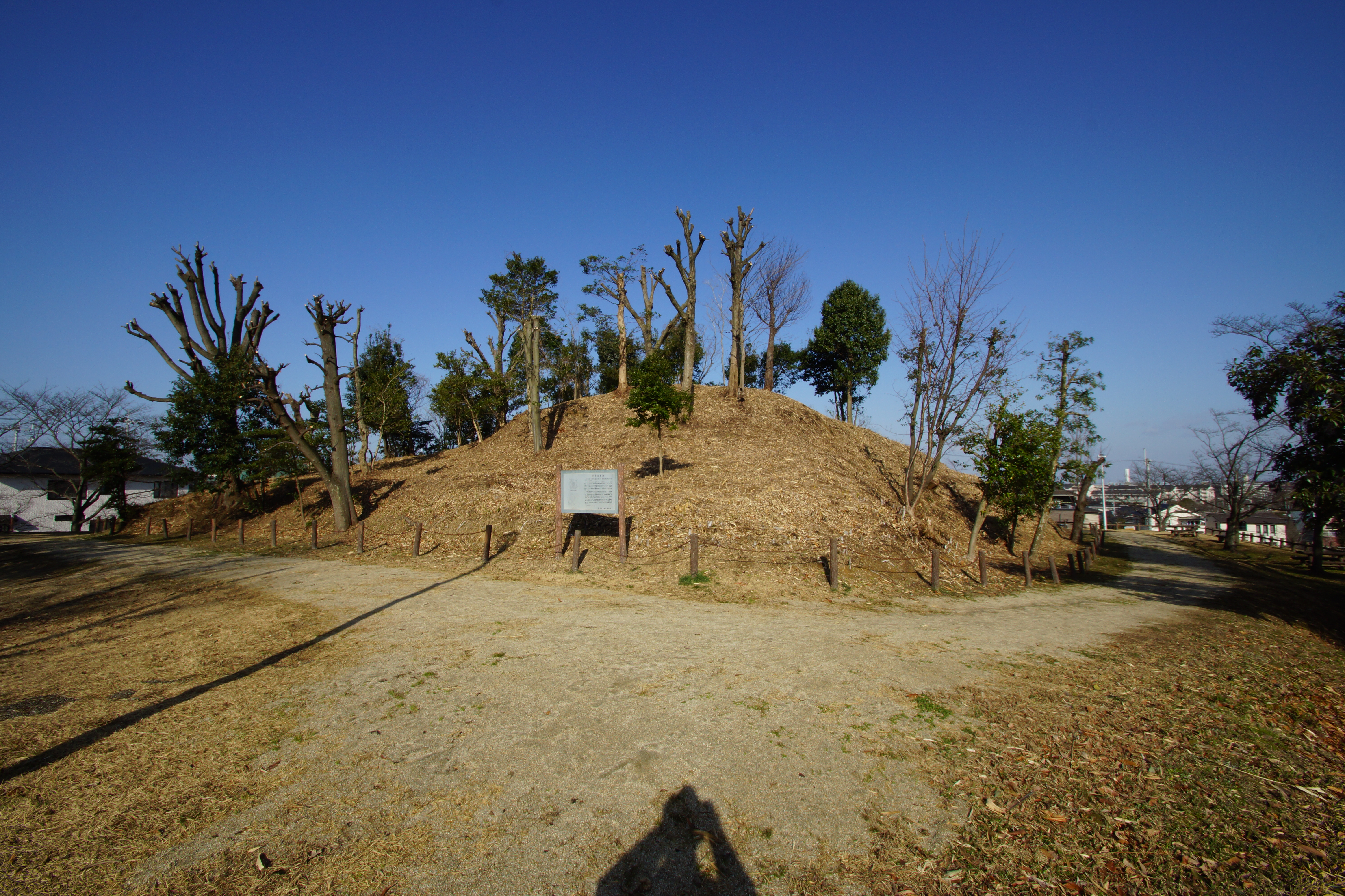 古墳の築造年代については明らかではありませんが、この古墳の北東約700には、同じ方形の外形をしている宮林古墳(4世紀後半)があることや奈良県明日香村の石舞台古墳(7世紀)と外形が似ていることも年代を考える上で参考になると言えます。